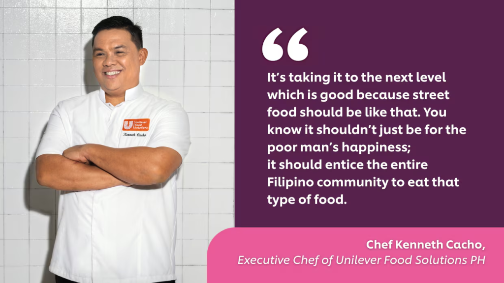 Chef Ken Cacho, Unilever Food Solutions Philippines’ executive chef, sums it up well: “It’s taking it to the next level which is good because street food should be like that. You know it shouldn’t just be for the poor man’s happiness; it should entice the entire Filipino community to eat that type of food.”