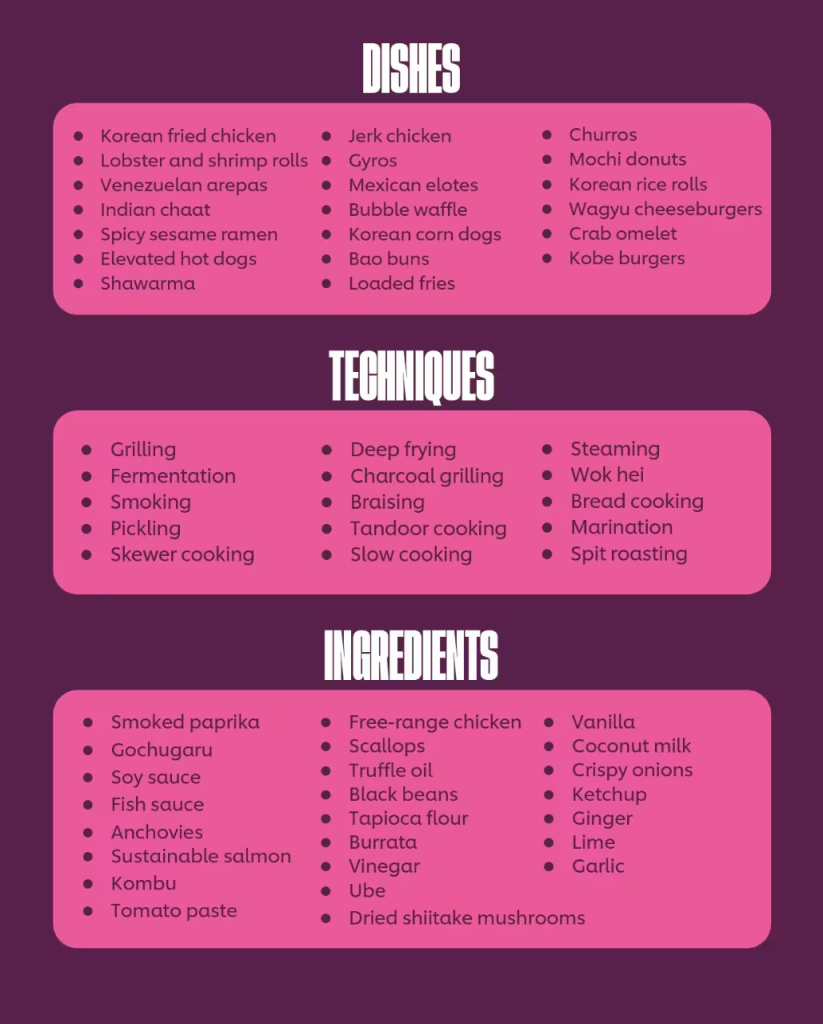 - Middle East: New-wave shawarma and kebabs are gaining popularity.