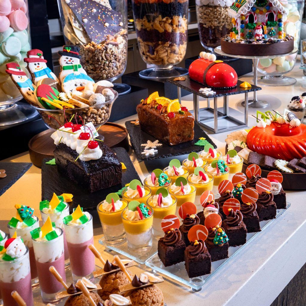 The carving station features an Herb-crusted Striploin for lunch, and Slow-roasted Angus Prime for dinner. In addition, freshly cut sashimi from a whole tuna plus a whole salmon at dinner are certain crowd pleasers, together with the irresistible seafood selection consisting of prawns, Chilean mussels, Manila clams, blue swimmer crabs, slipper lobsters, curacha, served alongside an assortment of sushi, maki, and nigiri. Not-to-missed are the signature dishes of various cuisines: Italian, Indian, Chinese, Thai, and Filipino, among others. An array of cold cuts and cheeses, a variety of holiday-themed cakes and confections, an indulgent chocolate fountain, and local dessert favorites elevate the New Year’s Eve indulgence.